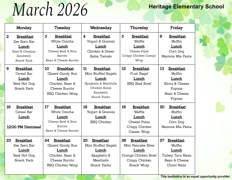 Midterm Progress Notices Mailed: Heritage Elementary School will mail midterm progress toward the end of this week. We request parents carefully review the grade reports, celebrate their children’s successes, set goals for the remainder of the school year, and contact us with any questions or concerns.